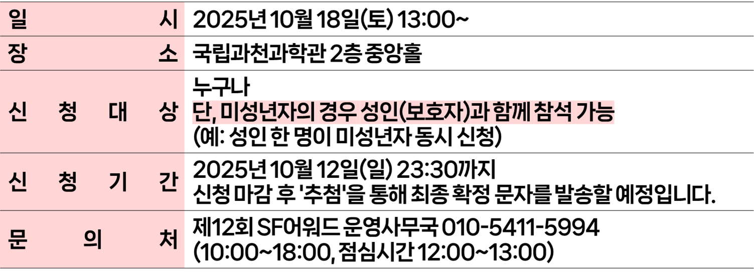| 「제12회 SF어워드」 시상식 사전신청 안내 (0) | 2025.10.01 |