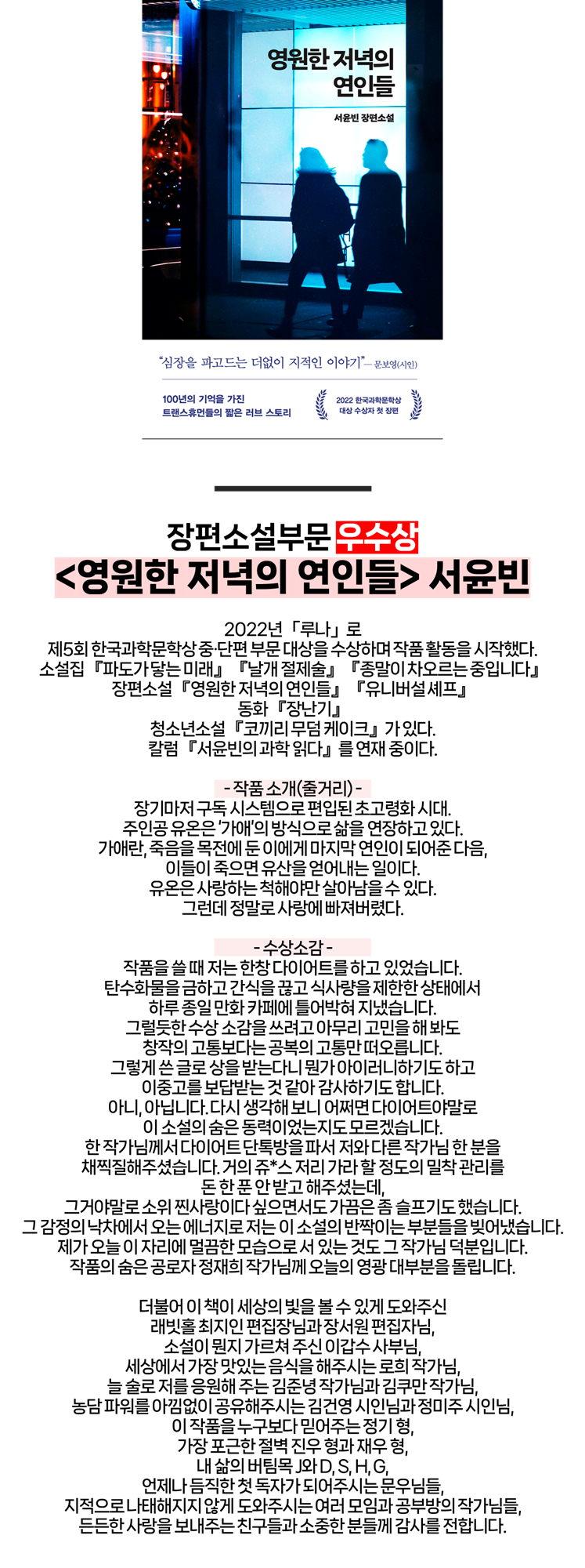 또 다른 우수상 수상작인 서윤빈 작가의 [영원한 저녁의 연인들]은 흥미롭게도 본격 연애소설입니다. 통상 장르물로서 소비되는 ‘로맨스’가 아니라 사랑을 나누고 겪어내는 인물들의 내면에서 어떤 화학작용이 벌어지는지 관찰하는 것이 주된 관심사인 그 연애소설 말이죠. 이것은 예심과 본심을 통털어 무척 보기 드문 소재라서 강한 흥미를 불러일으켰습니다.