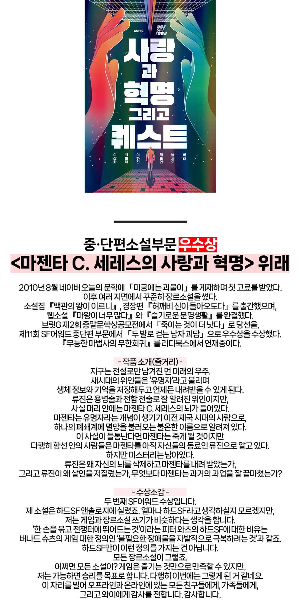 〈마젠타 C. 세레스의 사랑과 혁명〉에서 위래 작가는 인간이 가진 사랑의 양면성, 즉 상대방을 향한 이타적 헌신과, 때때로 살인 충동까지 다다르기도 하는 폭력적 충동 사이의 월경을 과학적 설정을 토대로 그려냈습니다. 장대한 스케일의 시간대와 우주를 배경으로 펼쳐지는 스페이스 오페라의 맛, 주어진 의문을 해결하는 미스터리 장르의 문법까지 모두 살렸다는 점에서 장르적으로 맛깔스러운 작품이었습니다. 세계 설정이 이야기의 모든 것을—사건, 인물, 감정까지도—지시하고 더 나아가 설정으로 환원시켜버리는 경향이 있다는 점이 심사위원들 사이에서 한계로 지적되기도 했지만 도리어 작품 고유의 매력으로 읽히기도 했습니다. 작품이 불러일으키는 논쟁은 그 자체로 작품이 우리에게 질문을 던지는 힘을 가지고 있다는 뜻이기도 합니다.