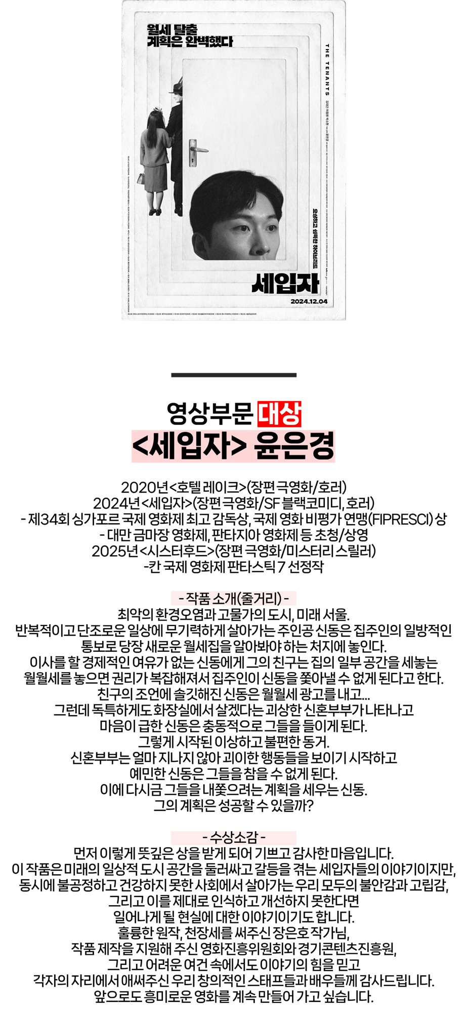올해의 수상작들에서는 '희망'보다 ‘버티기’라는 경향을 보이는 것은 마치 영화계가 겪고 있는 상황의 프리즘과도 같다. 폐지되거나 축소된 영화제들, 통합되거나 사라진 지원제도와 정책들의 마른 땅을 버티고 생존한 감독들에게 지지와 응원을 보낸다.