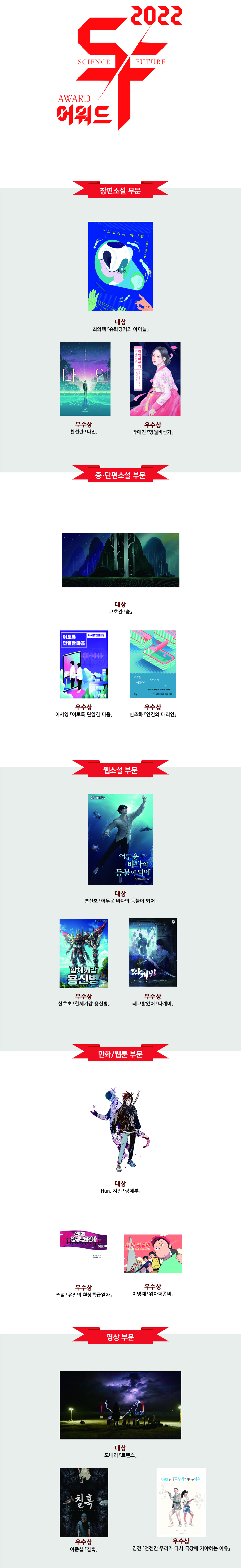 | SF 어워드 2022 수상자/수상작 정보, 수상소감, 심사평 링크 장편소설 부문 중·단편소설 부문 웹소설 부문 만화·웹툰 부문 영상 부문 심사위원 소개 |