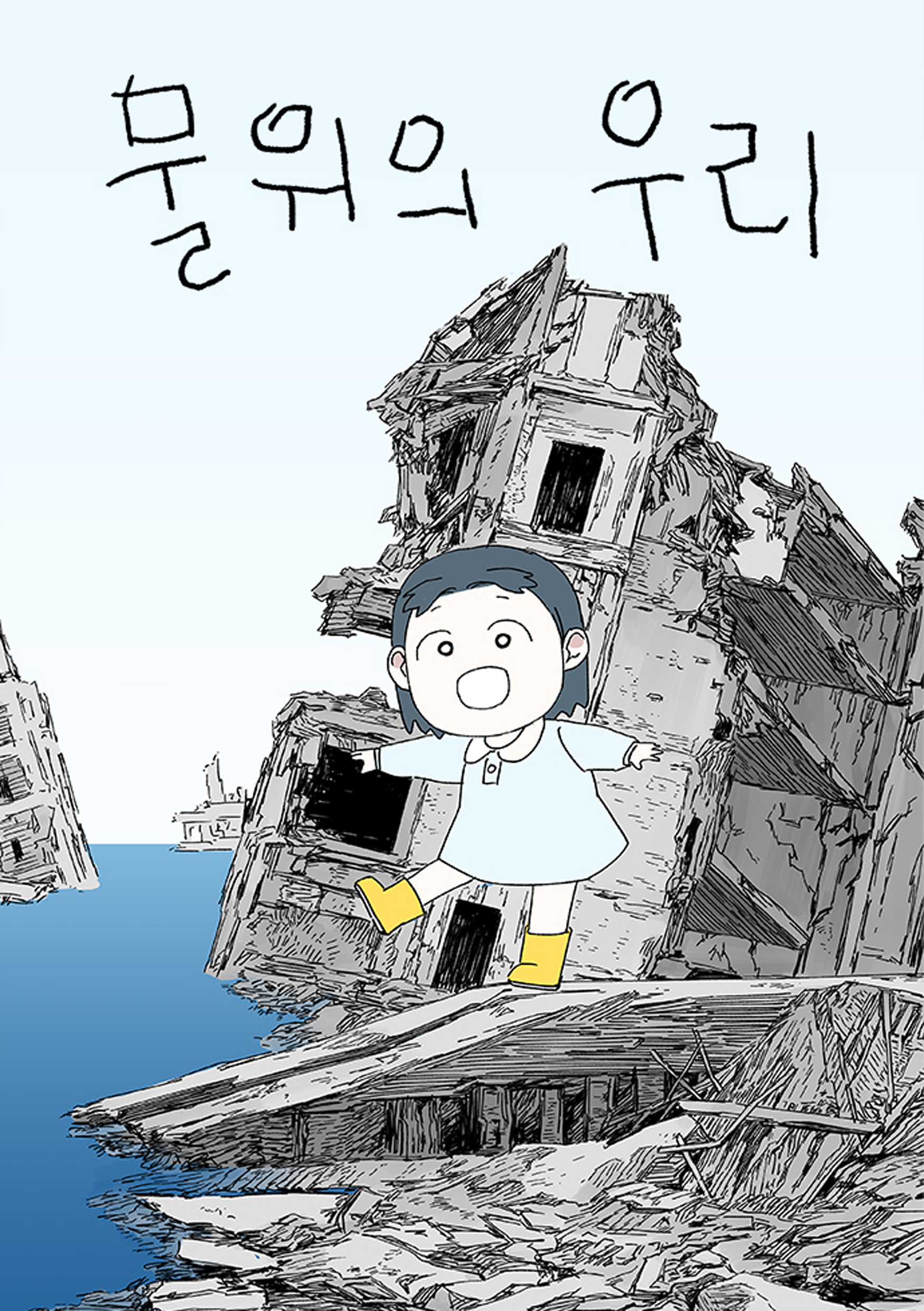 네이버웹툰에서 연재 중인 뱁새/왈패 작가님의 <물위의 우리>는 2022년 SF어워드에서도 눈여겨 봤던 작품입니다. 기후 위기와 불평등으로 말미암은 세계에서 여전히 삶을 살아가는 이들의 이야기가 펼쳐집니다. <물위의 우리>의 시작은 거대한 세계의 비밀을 숨긴 채 귀엽고 따뜻하게 전개되며 마음을 빼앗습니다. 실은 이 세계는 언제 사라질지 모른다는 기시감이 확신으로 변하며 작품의 분위기마저 달라집니다. 귀엽고 단순한 선으로 이뤄진 캐릭터들과 사실적으로 그려진 배경이 조화롭게 어우러져 작품을 보는 재미를 배가시킵니다. 무엇을 보여야 할지를 정확하게 알고 표현하는 작화와 연출이 이야기를 더욱 빛나게 만드는 작품입니다. 아직 연재 중인 이 작품이 완결될 즈음에는 절망이 아닌 희망을 보여줬으면 좋겠습니다.
