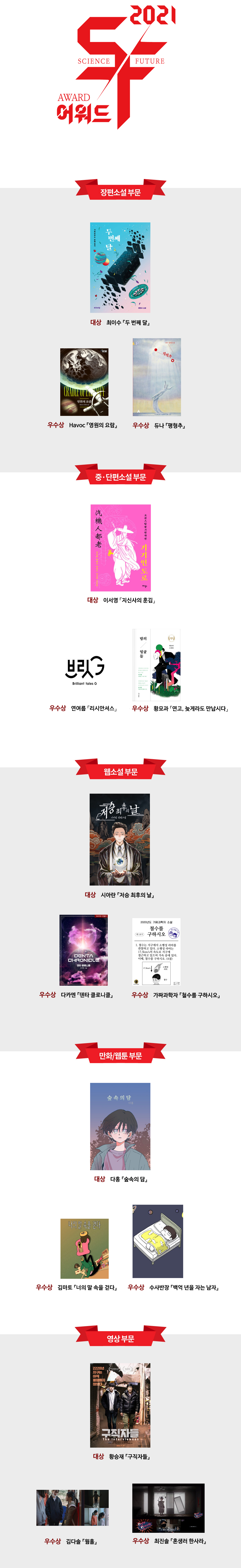 | SF 어워드 2021 수상자/수상작 정보, 수상소감, 심사평 링크 장편소설 부문 중단편소설 부문 웹소설 부문 만화/웹툰 부문 영상 부문 심사위원 소개 |